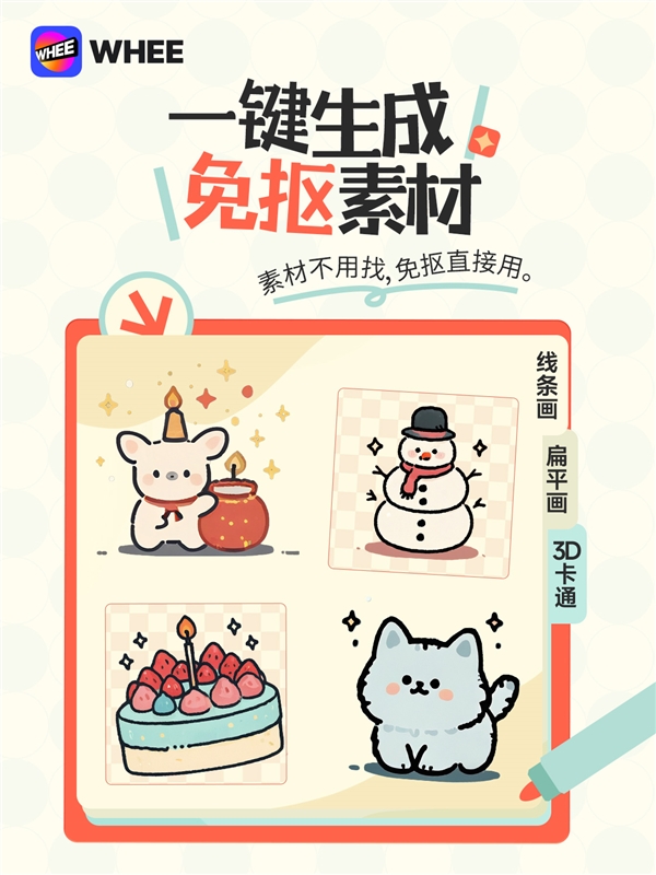 该功能处理了AI正在中文字体生成中变形、乱码的难题,正在市场现有的AI产物中,WHEE还同步推出了“免抠素材”功能,并供给了丰硕的定制化模板,中文的图像生成一曲是棘手问题,一键生成定制化的PNG素材,这也是目前市道上唯逐个款支撑中文海报文字自定义的AI产物。此外,使更多非专业设想师也能轻松制做出专业水准的海报。创制出气概多样、分歧排版的中文海报,极容易呈现乱码、变形等问题,